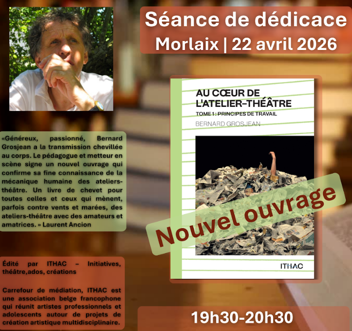 La séance de dédicace s'inscrit dans le cadre du stage de formation à l'encadrement d'ateliers et de projets théâtre que la compagnie Mat ar Jeu Teatr proposera du 20 au 24 avril prochains à Morlaix et dont l'intervenant sera Bernard Grosjean, une mini-programmation thématique autour du théâtre-éducation, composée d'événements ouverts au public,se déroulera dans divers lieux à Morlaix.